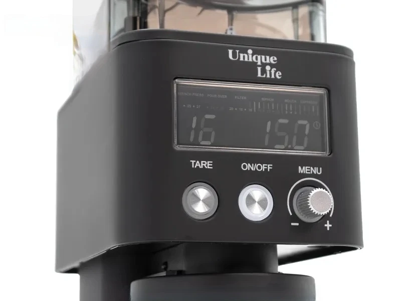 - تنظیمات دقیق منو شامل زمان آسیاب، تعداد فنجان، و وزن دقیق قهوه (گرم و اونس)